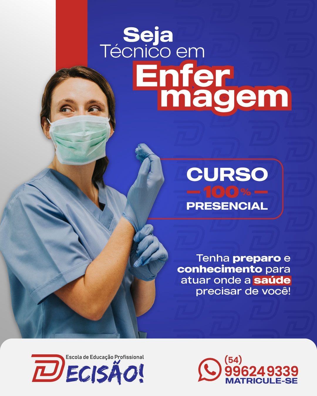 O curso de técnico de Enfermagem tem duração de 2 anos e ensina o aluno a auxiliar médicos e enfermeiros graduados nos cuidados com os pacientes. Desse modo, com essa formação, você consegue emprego em consultórios, postos de saúde, hospitais, laboratórios, ambulatórios, home care e cuidados com idosos.